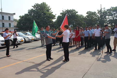 圖二:(劉迎波總經(jīng)理將旗幟傳遞給九州駕校集團(tuán)李潔總經(jīng)理)