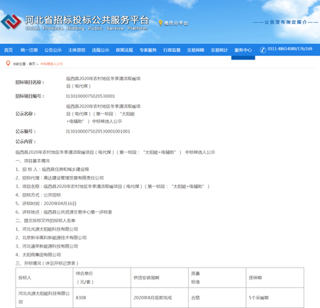 2020年,一場突如其來的疫情席卷全國,蔓延全球。隔離疫情不隔離服務(wù),在此特殊時期,光源公司積極踐行企業(yè)社會責(zé)任,保障復(fù)工復(fù)產(chǎn)的同時統(tǒng)籌疫情防控,嚴(yán)防死守全面做好疫情防控工作,科學(xué)有序復(fù)工復(fù)產(chǎn)。全體光源人振奮精神,團(tuán)結(jié)協(xié)作,高效率、高質(zhì)量投入復(fù)工后的公開投標(biāo)項目,憑借三十余年行業(yè)經(jīng)驗和口口相傳的業(yè)界優(yōu)良口碑,以及雄厚的綜合實力,持續(xù)為客戶提供優(yōu)質(zhì)的產(chǎn)品和專業(yè)的售后服務(wù)。河北光源太陽能科技有限公司,中標(biāo)臨西縣2020年農(nóng)村地區(qū)冬季清潔取暖項目(電代煤)(第一標(biāo)段:“太陽能+電輔助”)。