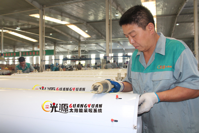 河北光源太陽能科技有限公司員工在制桶生產(chǎn)線上加班加點趕制太陽能采暖水箱。
