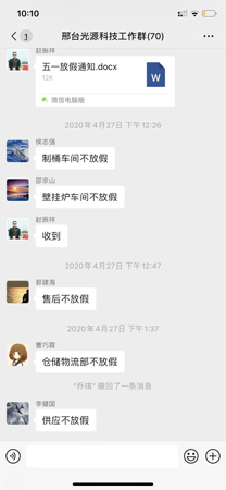 “五.一”前的4月27日,光源太陽(yáng)能科技公司下發(fā)了“五.一”放假的通知。通知說(shuō):“經(jīng)公司領(lǐng)導(dǎo)研究決定,自2020年5月1日——2020年5月5日(“五.一”國(guó)際勞動(dòng)節(jié))放假五天。”